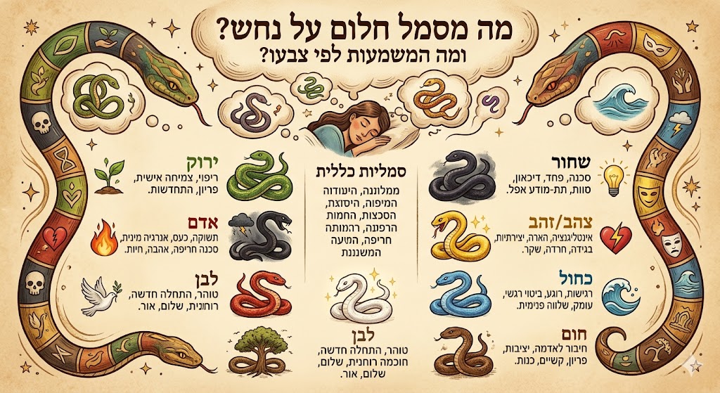 חלום על נחש מסמל ברוב התרבויות והגישות הפסיכולוגיות תהליכי שינוי עמוקים, התחדשות אישית, רפואה, או לחלופין אזהרה חמורה מפני פחדים נסתרים ואנשים רעילים בסביבה הקרובה. המשמעות משתנה מהותית לפי צבע החיה המופיעה בחיזיון: נחש שחור מצביע על פחדים עמוקים וסכנה מוחשית, נחש ירוק מסמל ריפוי טבעי והתחלה חדשה, נחש לבן מייצג טוהר והארה רוחנית, נחש צהוב רומז על אינטואיציה עמוקה וחוכמה פנימית, ואילו נחש אדום מהווה נורת אזהרה לסכנה ורגשות סוערים שיצאו מכלל שליטה.